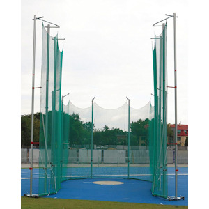 Gabbia protezione disco/martello, interamente in alluminio con 6 montanti mt. 7,00 diametro 120 mm, 4 montanti mt. 10,00. N° 2 portelloni anteriori mt. 10,00 con pali diametro mm. 150. Sistema di fissaggio con contro piastre da cementare su plinti. Rete con sistema ad argani e carrucole auto bloccanti. Omologata IAAF.