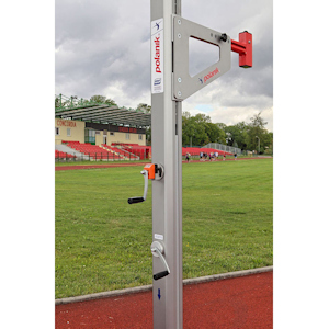 Ritti salto in alto per competizioni di tipo telescopico, montanti in alluminio, regolazione altezza mediante sistema a manovella e cremagliera, lettura diretta dell´altezza. Pesante basamento a T in acciaio verniciato, bolla di livello. Regolazione altezza da cm 110 a cm 265 . Doppi supporti asticella. Certificati IAAF